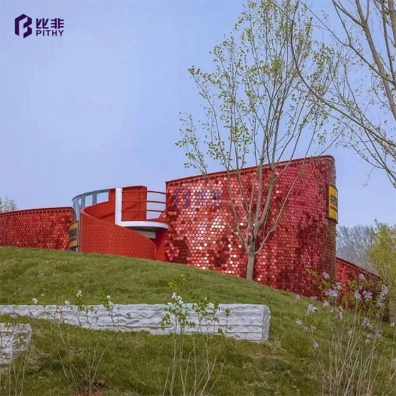 风动幕墙是近几年来最新颖的设计,其表面风铃片能够随风摆动,景墙自成风景,通过不同元素的组合搭配不同的材质,采用不同的色彩,甚至是在设计技术上的千奇百怪的应用,最终设计出金属与艺术结合的装饰建筑产物“风动幕墙”。